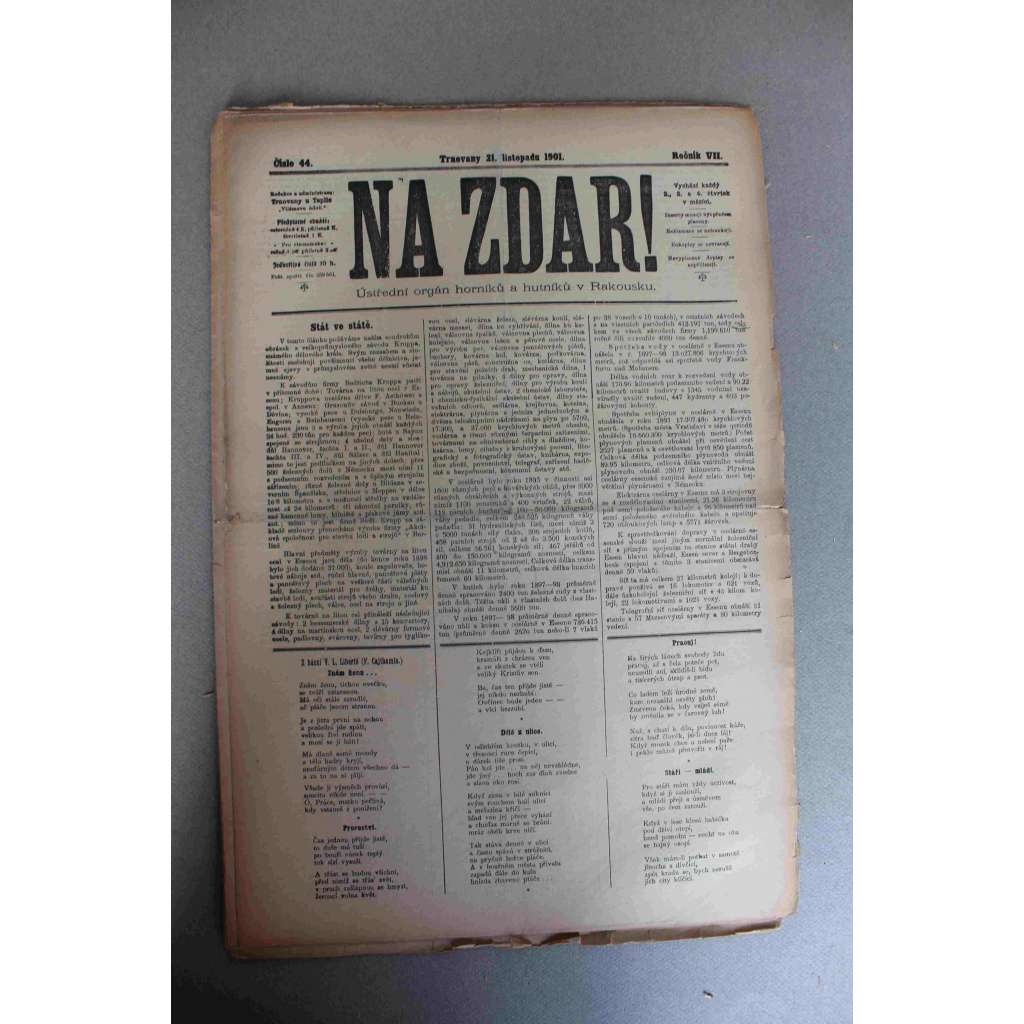 Na zdar! 1901, roč. VII (noviny, týdeník, hornictví, mj. Nový věk a hornictvo, Odborové sdružení a socialismus, Obrázky z království Rotschildova, Letem kladensko-slanským uhelným revírem)