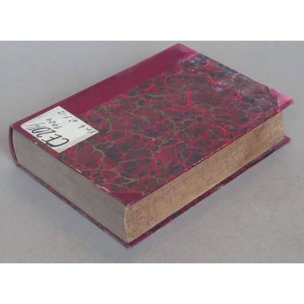 Stav knihy: Uspokojivý stav; desky opotřebované, na zadní desce nalepen štítek, na přední předsádce je štítek, signatura a razítka, zadní deska, předsádky a stránky mají podél okraje vybledlou skvrnu od vody (většina stránek jen nevýraznou), na některých stranách je razítko knihovny.