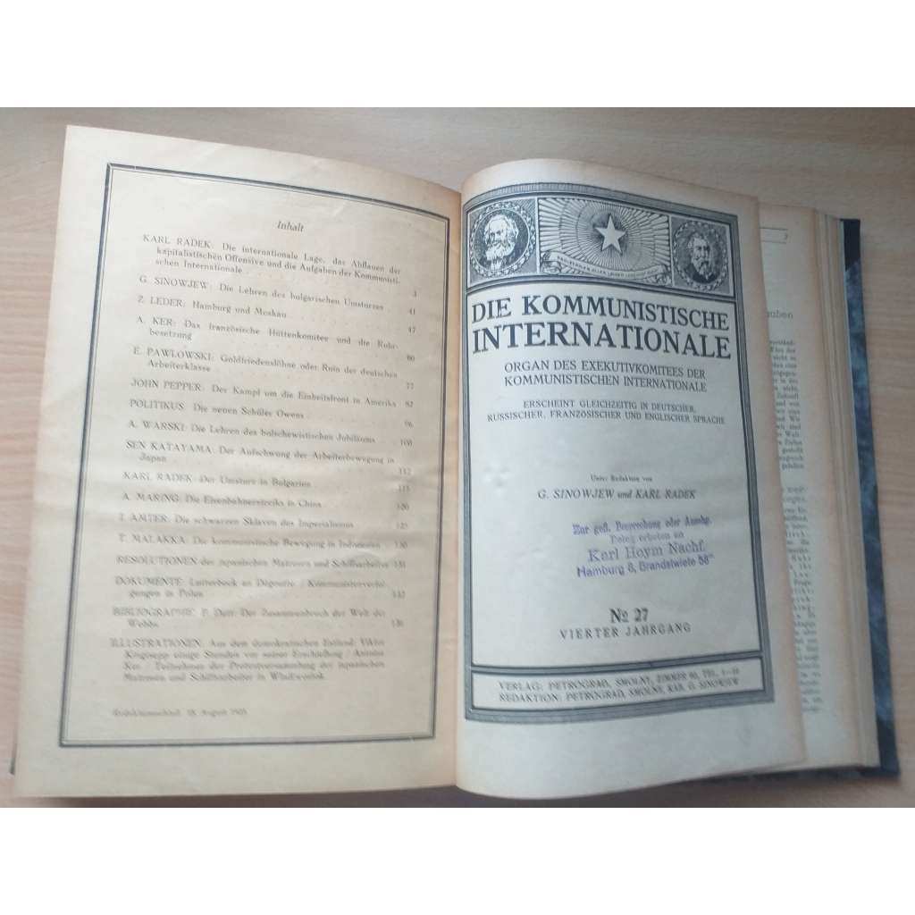Orgán výkonného výboru Komunistické internacionály; s obsahem I., II. a III. ročníku, věcným rejstříkem a rejstříkem osob. 4. světový kongres Komunistické internacionály, konference Labouristické strany, třídní boj v Japonsku, taktika jednotné fronty, politika a strany ve Velké Británii, republikánský boj v Irsku, III. světový kongres Komunistické internacionály mládeže, fašismus u moci v Itálii, ofenzíva kapitálu, boj proti válce, XII. sjezd Komunistické strany Ruska (bolševiků), mezinárodní situace