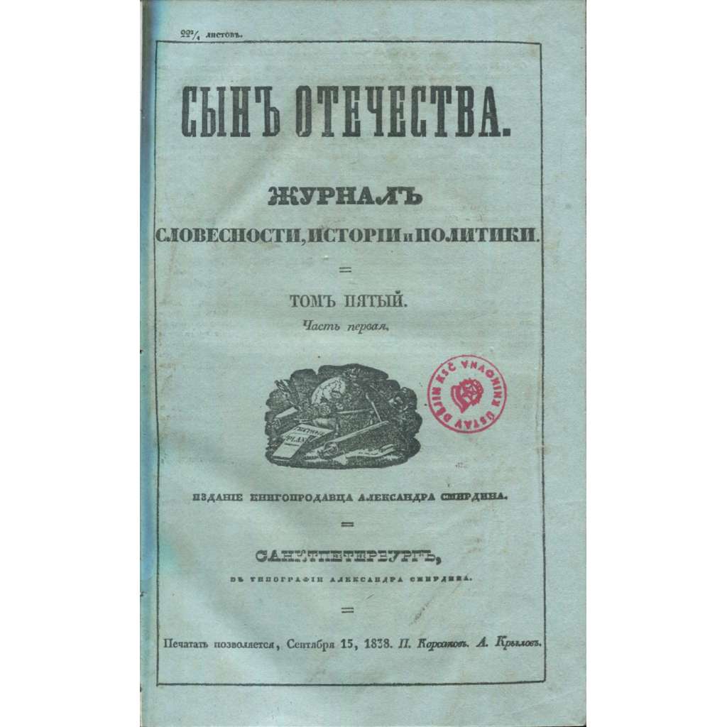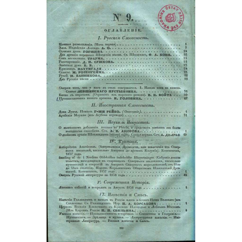 Jedno z čísel významného ruského literárního časopisu z první poloviny 19. století; jde o kompletní číslo 9 ze září 1838 (vydané jako první část pátého svazku zahrnujícího čísla 9 a 10). Původní obálka je vevázána. Viz naskenovaný obsah.