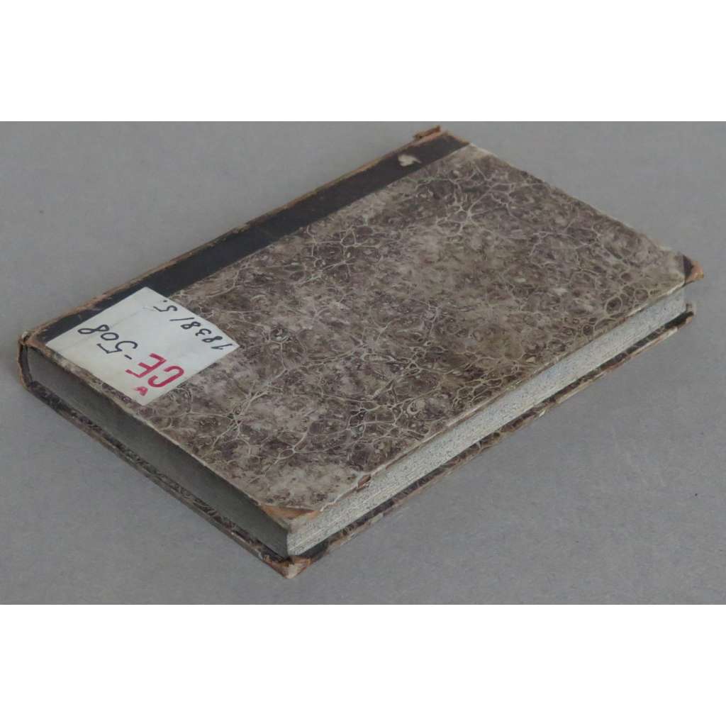Stav knihy: Dobrý stav; desky opotřebované, na zadní desce je nalepen štítek, rohy desek naražené, kůže na hřbetu s malou prasklinou, na přední předsádce je pár razítek a signatury, na obou částech původní obálky je razítko knihovny, stránky čisté, některé z nich s nevýraznými nažloutlými skvrnami od stáří.