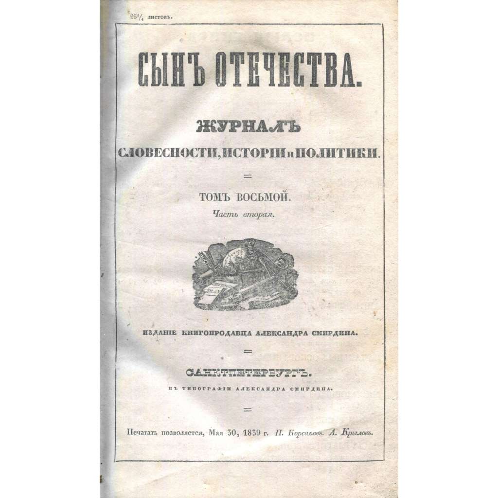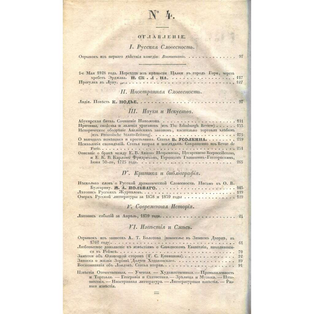 Jedno z čísel významného ruského literárního časopisu z první poloviny 19. století; jde o kompletní číslo 4 vydané v květnu 1839 (vyšlo jako druhá část osmého svazku zahrnujícího čísla 3 a 4, nominálně z března a dubna). Původní obálka je vevázána. Viz naskenovaný obsah.