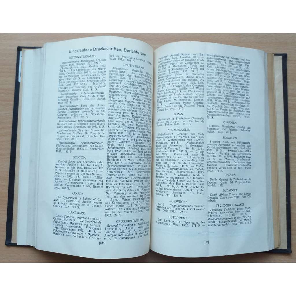 Vydání: Berlin: Internationaler Gewerkschaftsbund 1932. Poloplátěná vazba se zlaceným titulem na hřbetu a zdobenou ořízkou, 210 stran, 4° (16 x 23 cm)