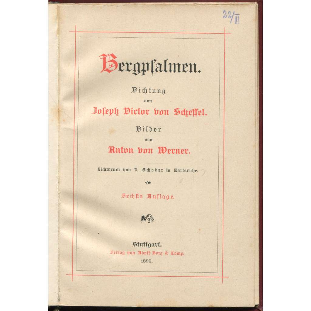 Vydání: Stuttgart: Adolf Bonz & Comp. 1895, ozdobná celoplátěná vazba se slepotiskem, zlatou a černou ražbou, zlacená ořízka, 80 stran s 6 reprodukcemi rytin, 12° (11 x 16 cm)