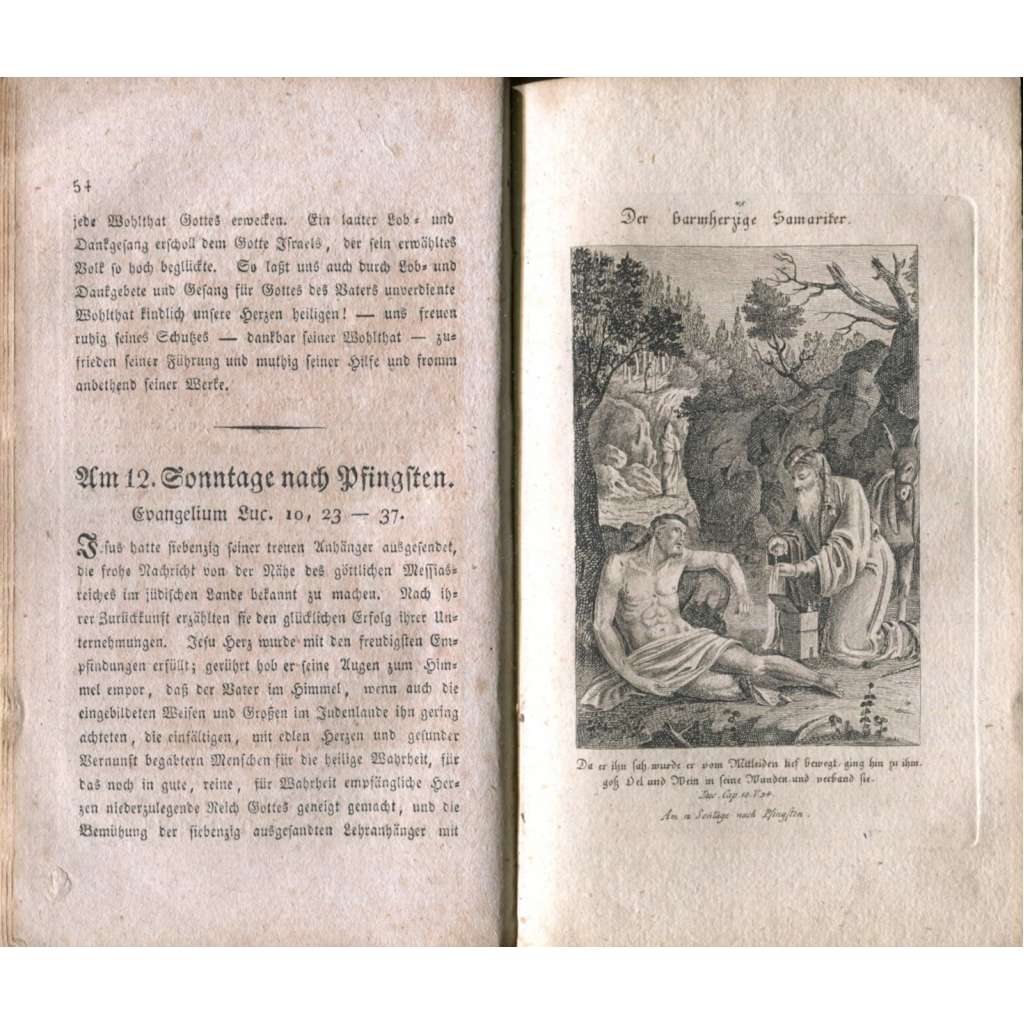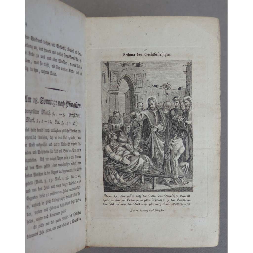 Populární výklady evangelií ilustrované 90 číslovanými celostránkovými mědiryty s výjevy z evangelií; dále výtisk obsahuje mědirytový frontispis a titul. Napsal Karel Hanl (1782–1874), tehdy farář ve Stráži nad Ohří, později významný církevní hodnostář a královohradecký biskup. Tři svazky jsou svázány do jednoho; doplněny jsou krátkým spiskem "Betrachtung und Beschreibung des heiligen Landes" (1827), který ovšem neobsahuje na titulní straně avizovanou mapu Svaté země. Jinak jsou svazky kompletní.