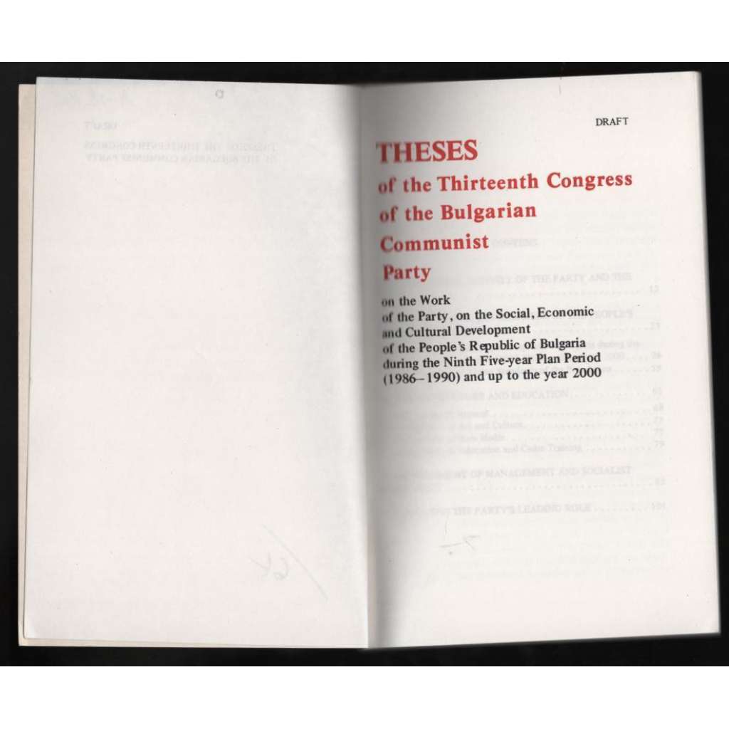 Celý titul: Draft Theses of the Thirteenth Congress of the Bulgarian Communist Party on the Work of the Party, on the Social, Economic and Cultural Development of the People´s Republic of Bulgaria during the Ninth Five-year Plan Period (1986-1990) and up to the Year 2000. Témata kongresu: mezinárodní aktivity, společenský a ekonomický rozvoj Bulharska, věda, kultura a vzdělávání, zlepšení správy a socialistické demokracie, posílení vedoucí role strany