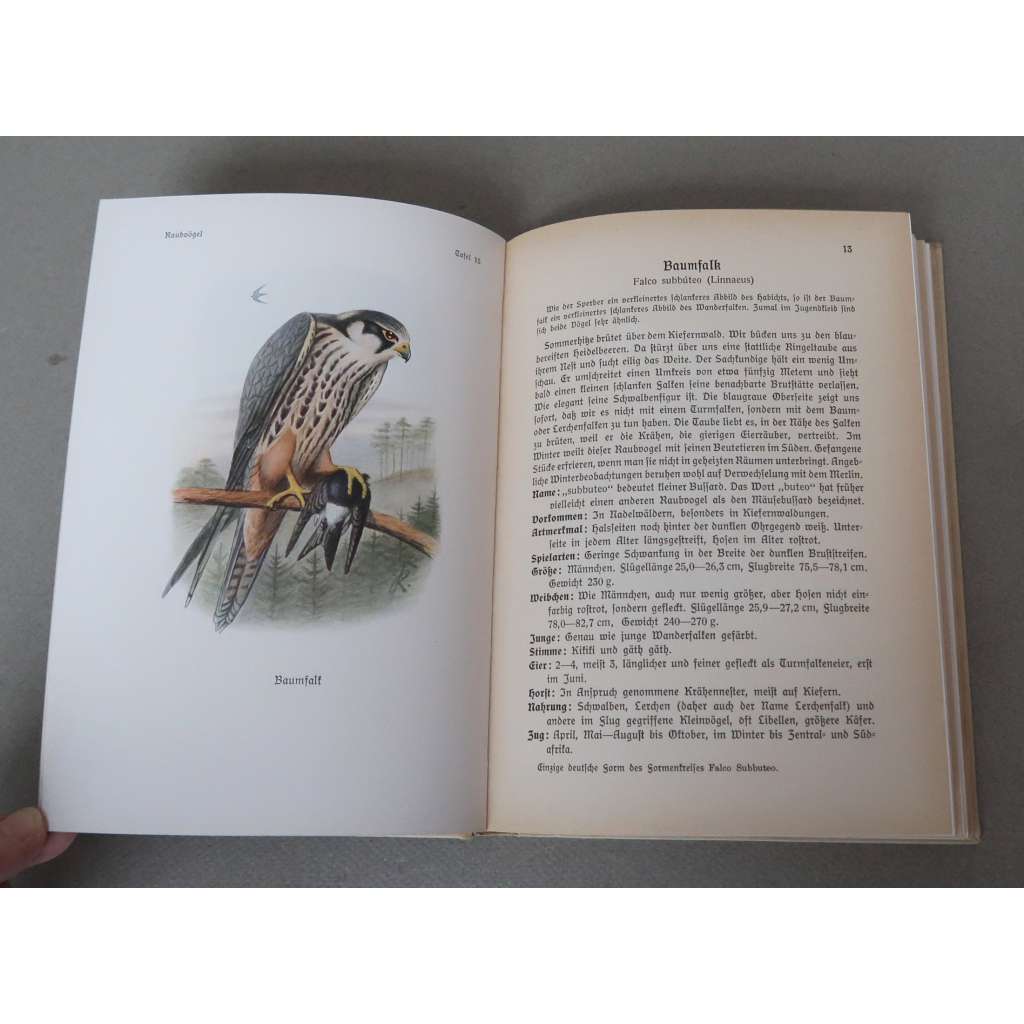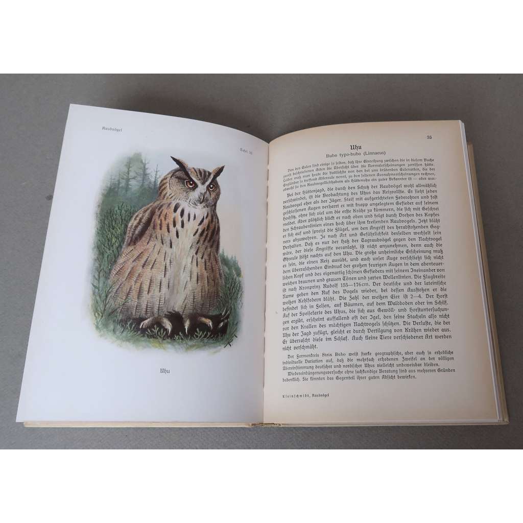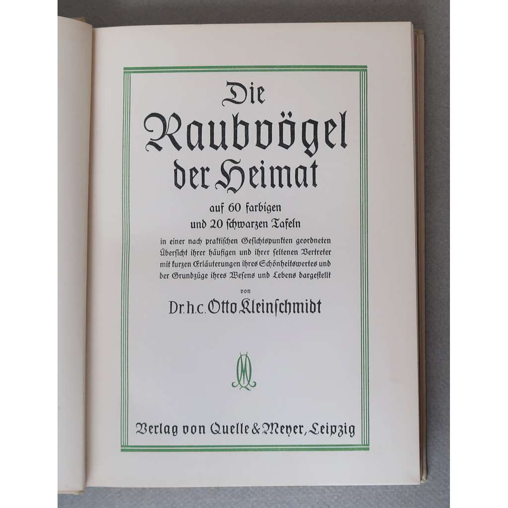 celý název: "Die Raubvögel der Heimat auf 60 farbigen und 20 schwarzen Tafeln, in einer nach praktischen Gesichtspunkten geordneten Übersicht ihrer hüfigen und ihrer seltenen Vertreter mit kurzen Erläuterungen ihres Schönheitswertes und der Grundzüge ihres Wesens und Lebens dargestellt von Dr.h.c. Otto Kleinschmidt"