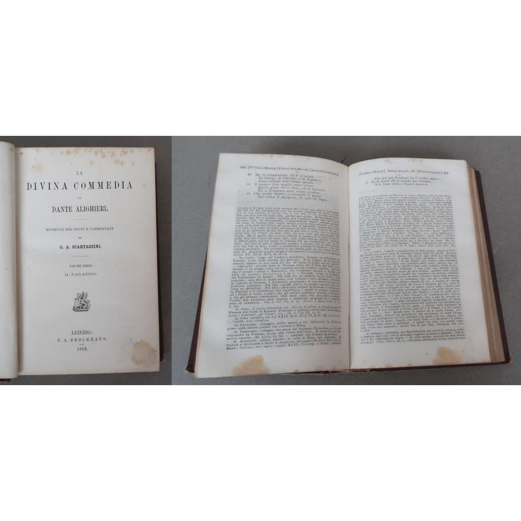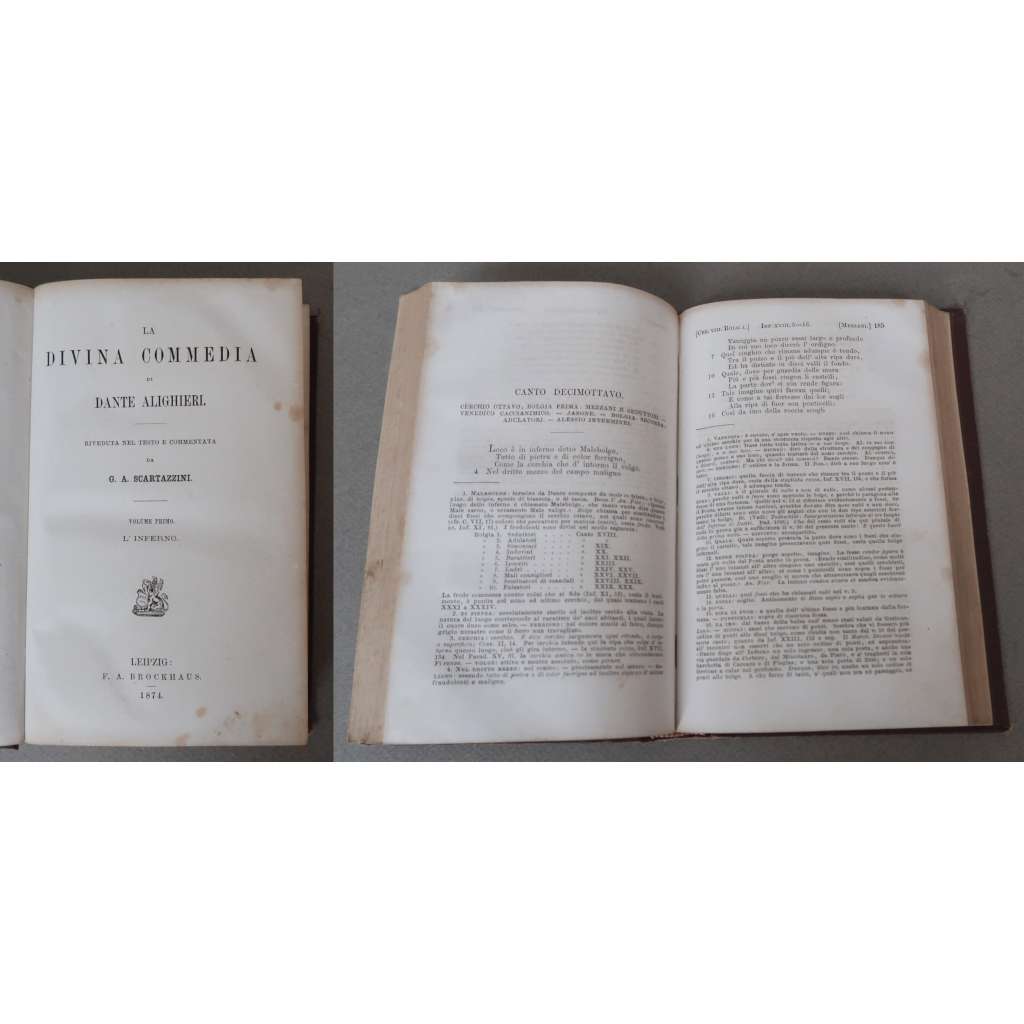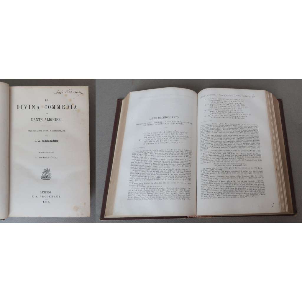 Vydání: Leipzig: F. A. Brockhaus 1874, 1875, 1882, 1890. Riveduta nel testo e commentata da G. A. Scartazzini. (Volume Primo: L' Inferno; Volume Secondo: Il Purgatorio; Volume Terzo: Il Paradiso; Volume Quarto: Prologomeni. Introduzione allo studio di Dante Alighieri e delle sue opere).