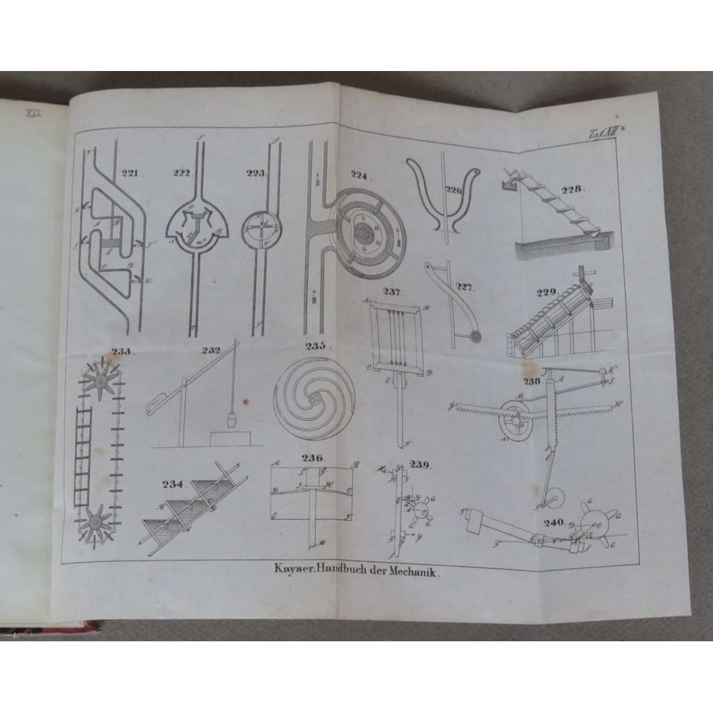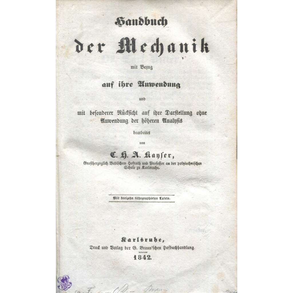 Velmi podrobná příručka mechaniky od Carla Heinricha Adolfa Kaysera (1798–1870), profesora na polytechnice v německém Karlsruhe. Výtisk obsahuje kompletní soubor 13 rozkládacích příloh s 249 ilustracemi/litografiemi.