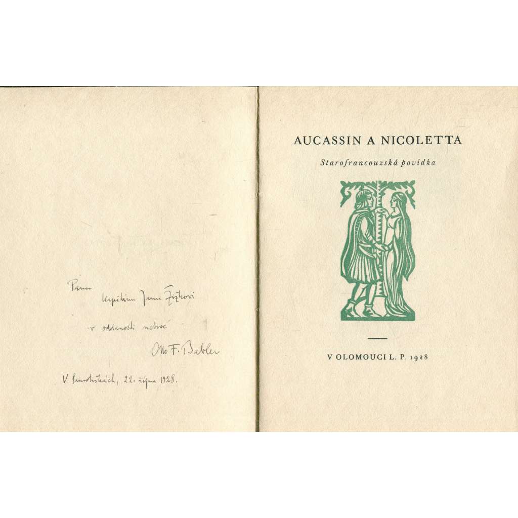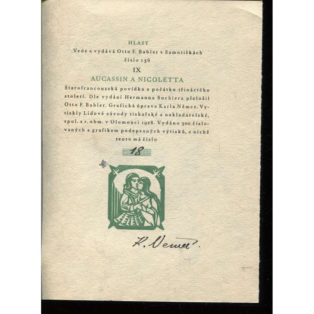 Aucassin a Nicoletta - Starofrancouzská povídka (podpis Otto F. Babler, podpis Karel Němec)