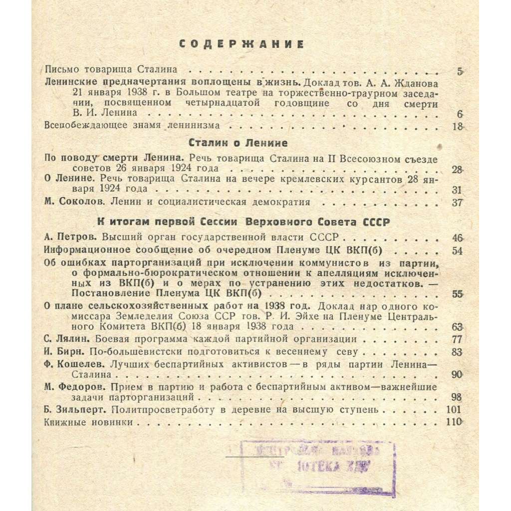 Sovětský časopis z dob vrcholného stalinismu; určen pro stranické aktivisty působící na vesnici. Viz naskenovaný obsah čísla 1–2. Svazek obsahuje čísla 1–2, 3, 6 a 7 z roku 1938.