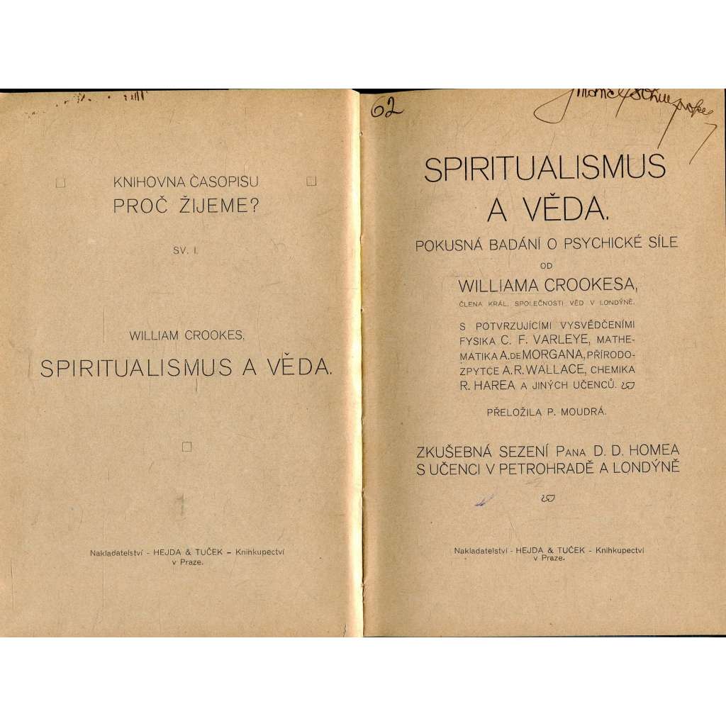 Podtitul: Pokusná badání o psychické síle. S potvrzujícími vysvědčeními fysika C.F. Varleye, mathematika A. de Morgana, přírodozpytce A.R. Wallace, chemika R. Harea a jiných učenců. Obsahuje též Zkušebná sezení pana D. D. Homea s učenci v Petrohradě a Londýně.