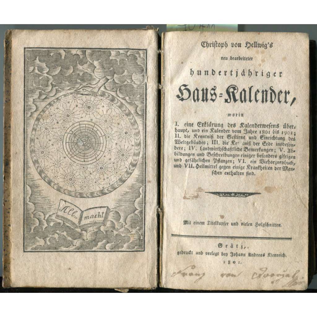 I. eine Erklärung des Kalenderwesens überhaupt, und ein Kalender vom Jahre 1801 bis 1901; II. die Kenntniß der Gestirne und Einrichtungen des Weltgebäudes; III. die Kenntniß der Erde ins besondere; IV. Landwirtschaftliche Bemerkungen; V. Abbildungen und Beschreibungen einiger besonders giftigen und gefährlichen Pflanzen; VI. ein Vieharzneybuch, und VII. Heilmittel gegen einige Krankheiten der Menschen enthalten sind. Mit einem Titelkupfer und vielen Holzschnitten