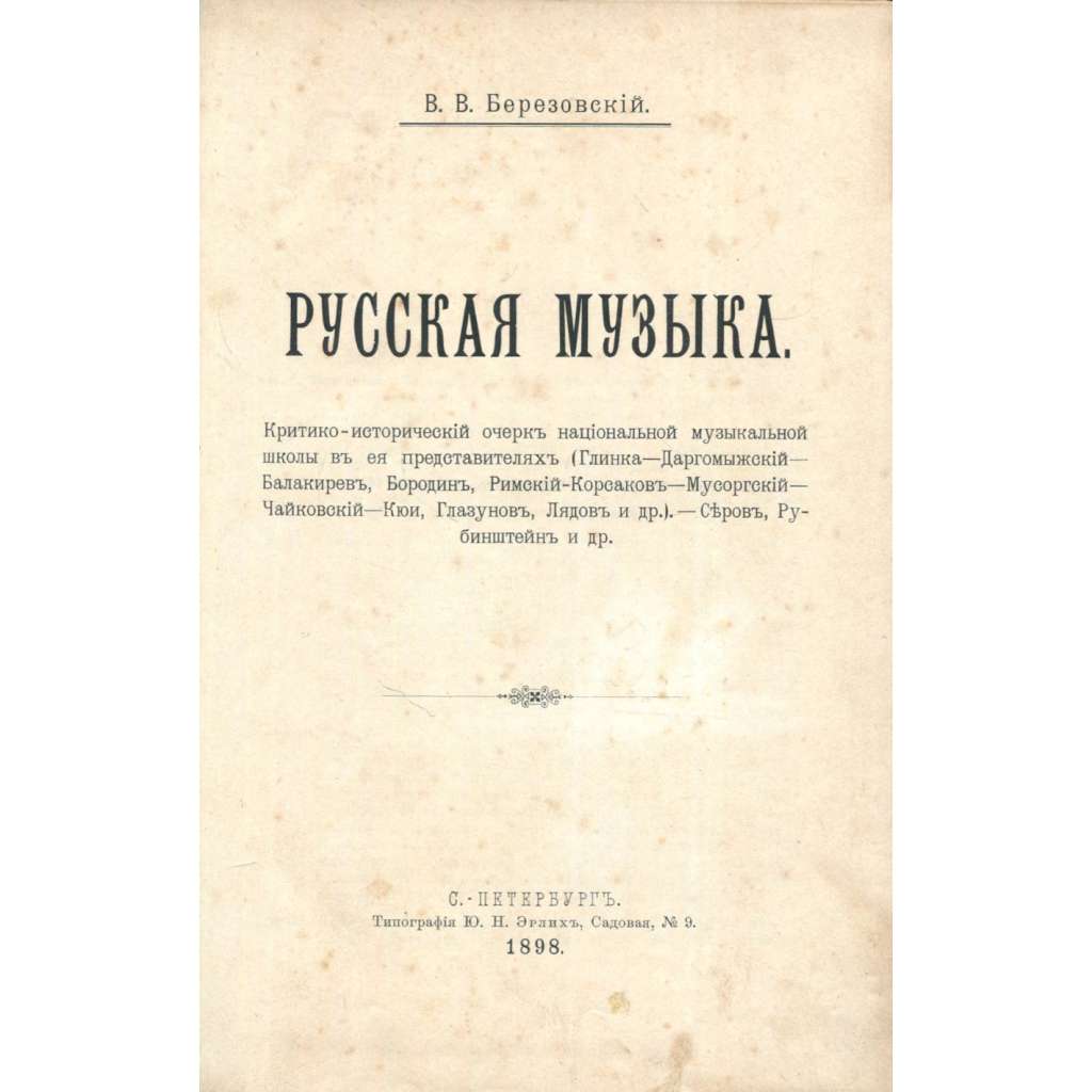 Celý titul a podtitul: "Русская музыка. Критико-исторический очерк национальной музыкальной школы в её представителях (Глинка — Даргомыжский — Балакирев, Бородин, Римский-Корсаков — Мусоргский — Чайковский — Кюи, Глазунов, Лядов и др.). — Серов, Рубинштейн и др." [Russkaja muzyka. Kritiko-istoričeskij očerk nacionalnoj muzykalnoj školy v ejo predstavitěljach (Glinka — Dargomyžskij — Balakirev, Borodin, Rimskij-Korsakov — Musorgskij - Čajkovskij — Kjui, Glazunov, Ljadov i dr.) — Serov, Rubinštejn i dr.]