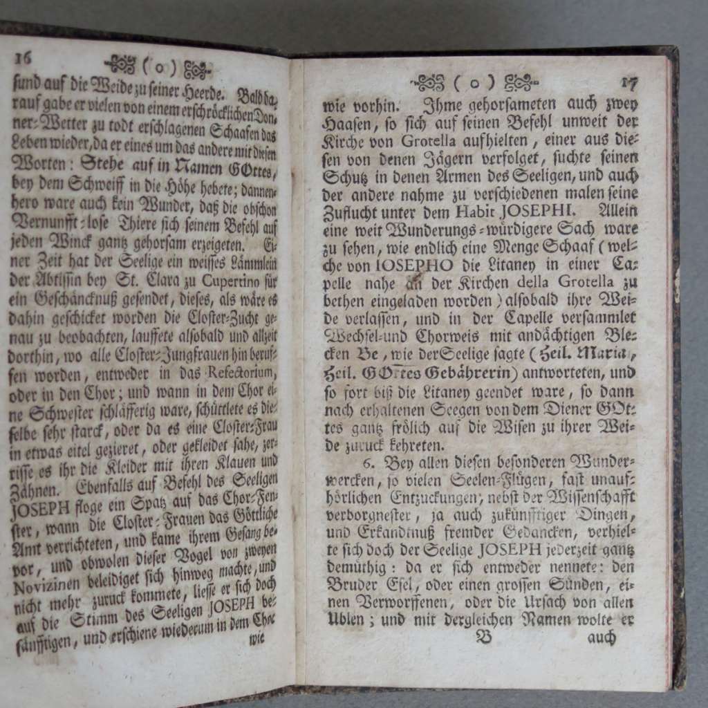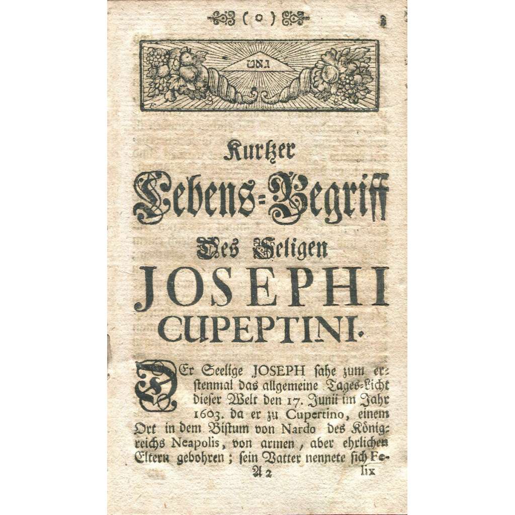 Celý titul: "Kurzer Begriff Des Lebens, Tugenden, Tods, Und Wunderwercken Des Seligen Josephi Von Cupertino, Priesters und Professen des Ordens deren Minderen Brüdern Conventualen des Heiligen Francisci, Welcher Von jetzo glorreichist regierender Päpstlichen Heiligkeit Benedicto dem XIV. der Zahl deren Seligen einverleibet worden." (Stručný popis života, ctností, smrti a zázraků blahoslaveného Josefa z Copertina, kněze a profesa řádu menších bratří konventuálů svatého Františka, jenž byl nynější slavně vládnoucí Jeho Svatostí papežem Benediktem XIV. pojat do počtu blahoslavených.)