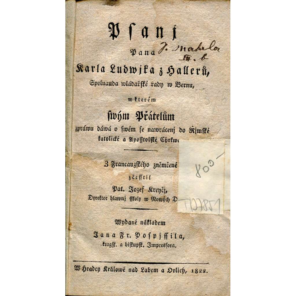 Vydání: Jan Fr. Pospíšil, 1822. Brožovaná, rozměry: 11,5 x 17 cm, stran 112