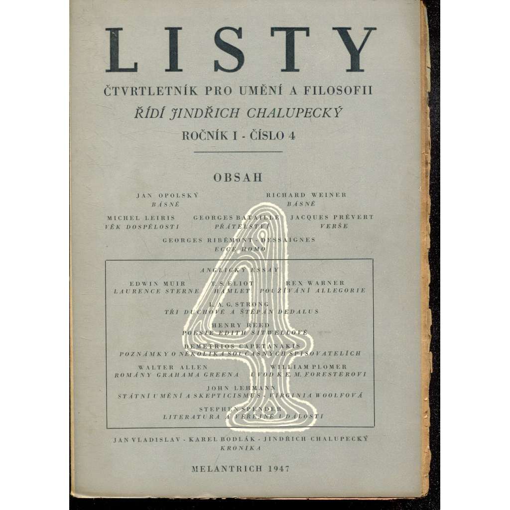 Listy, ročník I., číslo 1-4/1946. Čtvrtletník pro umění a filosofii (4 svazky)