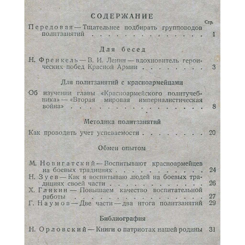 Některá čísla sovětského časopisu pro důstojníky a politruky Rudé armády zodpovědné za ideologické školení; viz naskenovaný obsah čísla 1. Svazek obsahuje různá čísla od ledna do května 1941; časopis vycházel 2krát měsíčně.