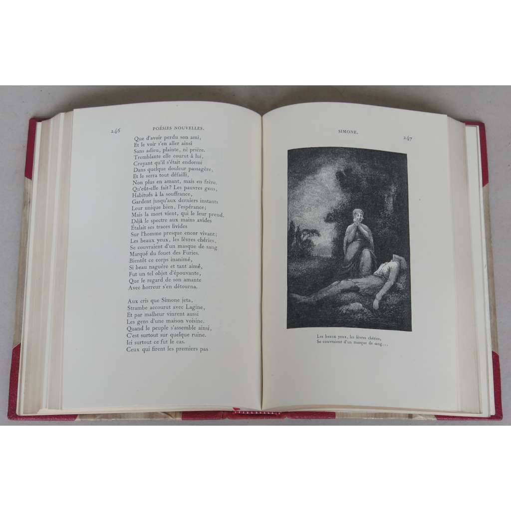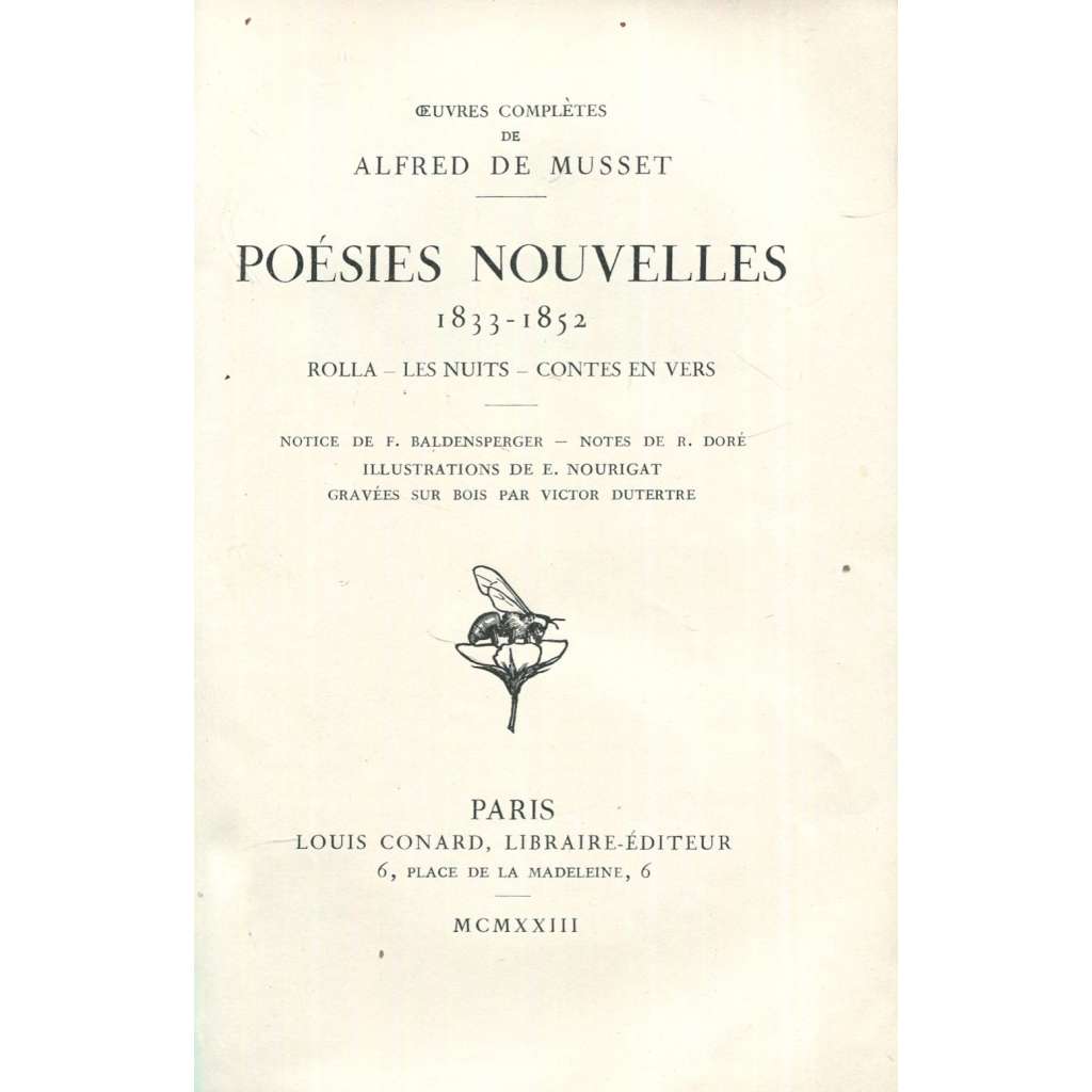 Mussetovy básně ilustrované mnoha dřevoryty (xylografiemi) Victora Dutertre podle předloh E. Nourrigata. Ucelený svazek řady "Oeuvres complètes de Alfred de Musset".