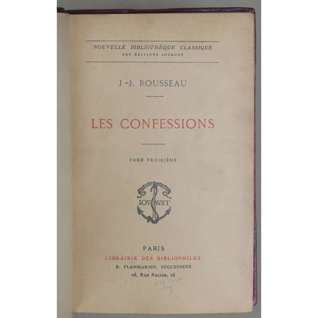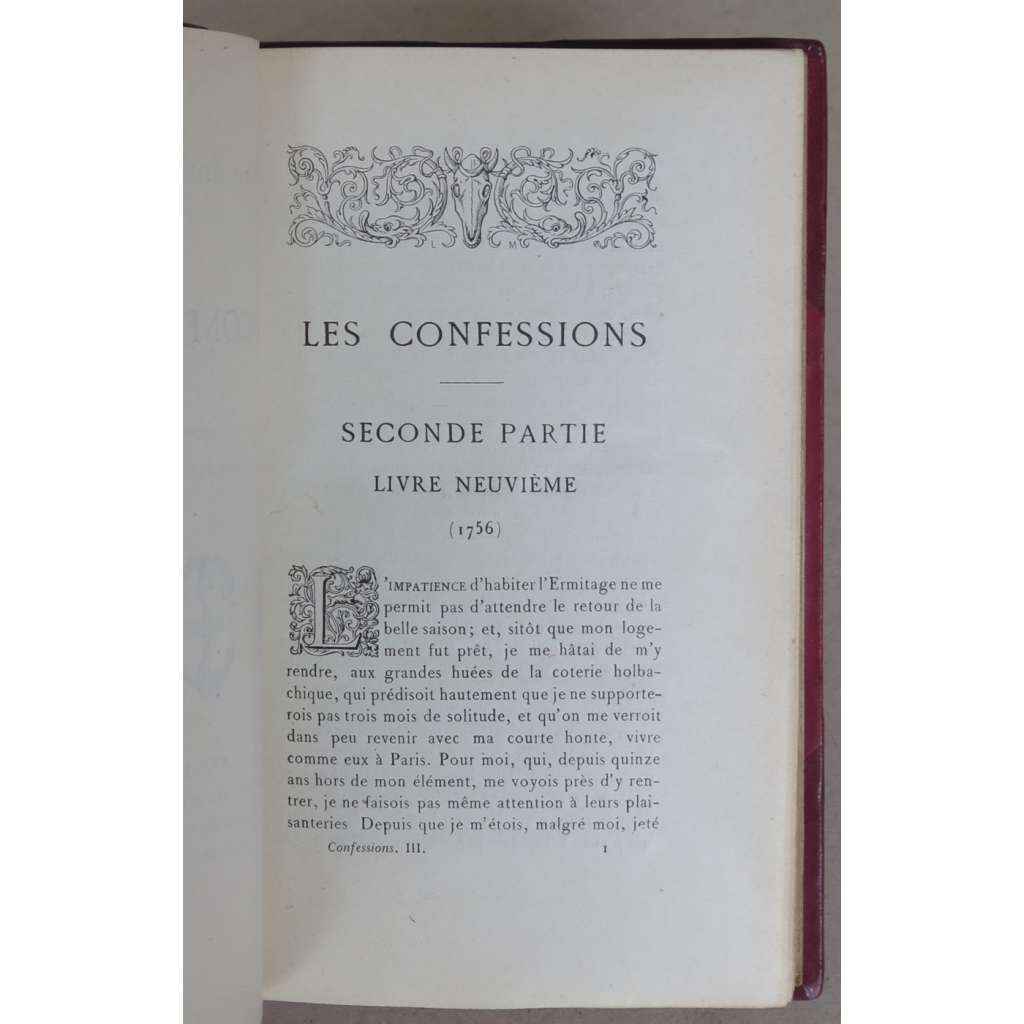 Třetí svazek třísvazkového anotovaného vydání Rousseauových "Vyznání"; vytištěno na kvalitním papíře; stránky jsou zdobeny vlysy a koncovými vinětami. Vyšlo v edici "Nouvelle bibliothèque classique des Éditions Jouaust", v níž byla publikována edičně a typograficky kvalitně upravená díla francouzských klasiků; edice se zaměřovala na sběratele. Zcela jistě vydáno po roce 1891, kdy Flammarion edici převzal.
