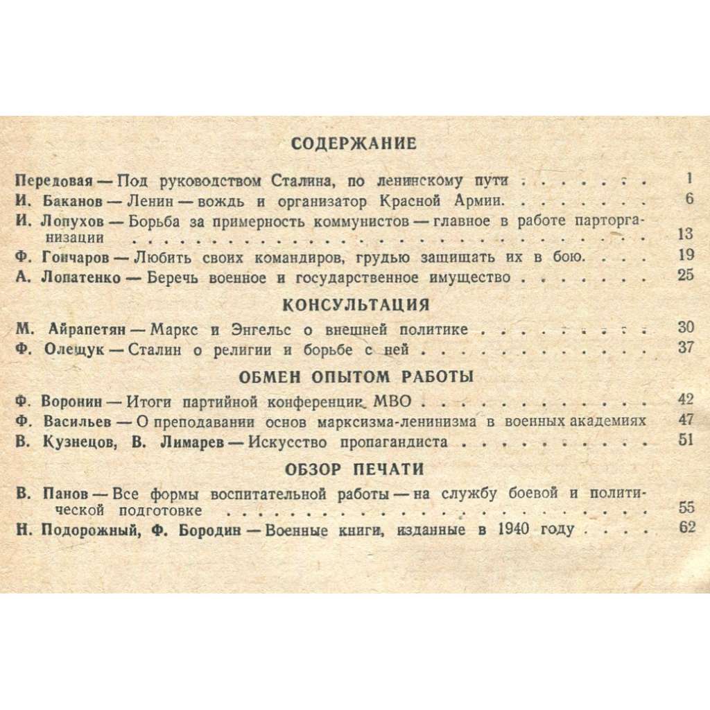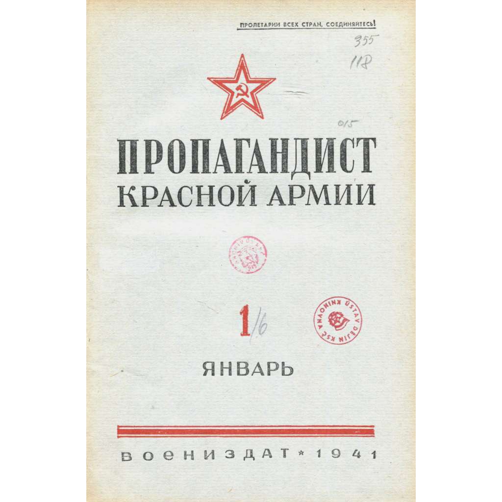 Časopis určený pro politické pracovníky v Rudé armádě, tj. pro osoby odpovědné za náležitou politickou výchovu a agitaci. Viz naskenovaný obsah čísla 1. Svázáno do dvou svazků, které obsahují podle všeho polovinu vydaných čísel; chybí čísla 11–14 a 17–24. Čísla 15 a 16 vyšla po útoku Německa na SSSR, kdy většina časopisů přestala vycházet. Předchozí ročníky vycházely pod odlišným titulem "Пропагандист и агитатор РККА" (Propagandist i agitator RKKA).