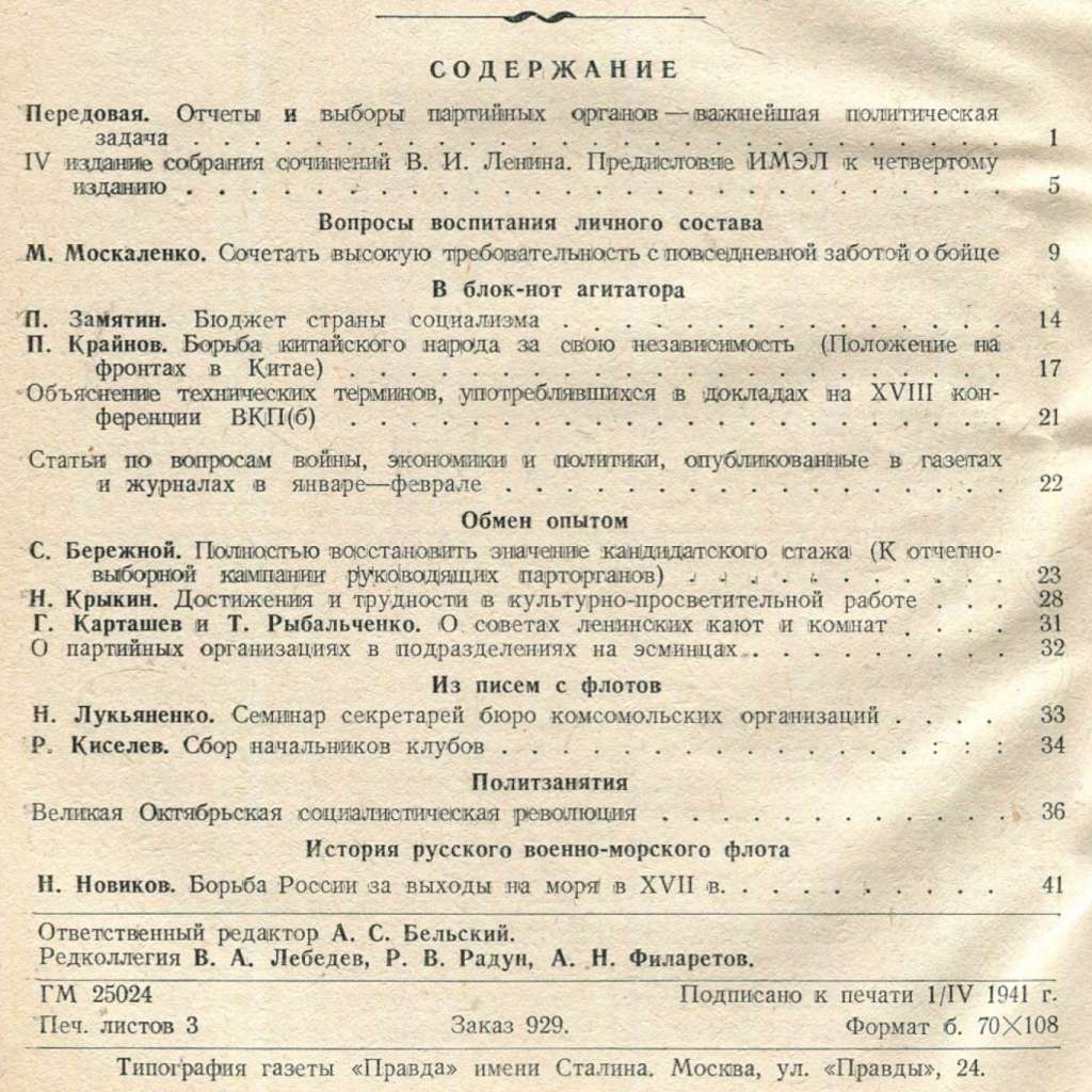 Tři čísla 3. ročníku sovětského časopisu pro politické pracovníky v sovětském námořnictvu, součásti ozbrojených sil SSSR. Viz naskenovaný obsah čísla 6. Svazek obsahuje čísla 6 (březen 1941), 7 a 8 (duben 1941).