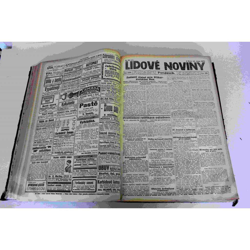Lidové noviny 1919, roč. XXVII. (deník, první republika, mj. Jde o Podkarpatskou Rus, Smlouva ČSR se spojenci, D´Annunzio prý nemoc a musí do Říma, Hlinkův případ, Druhé poselství presidenta Masaryka ČSR národu, 28. říjen)