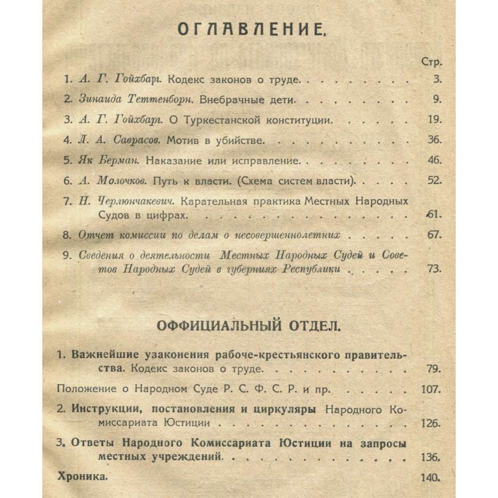Trojčíslo významného časopisu zaměřeného na zákonodarství a teorii práva v raném sovětském Rusku, kdy docházelo k velkým změnám v pracovním či rodinném právu. Viz naskenovaný obsah. Časopis vydával Lidový komisariát spravedlnosti.