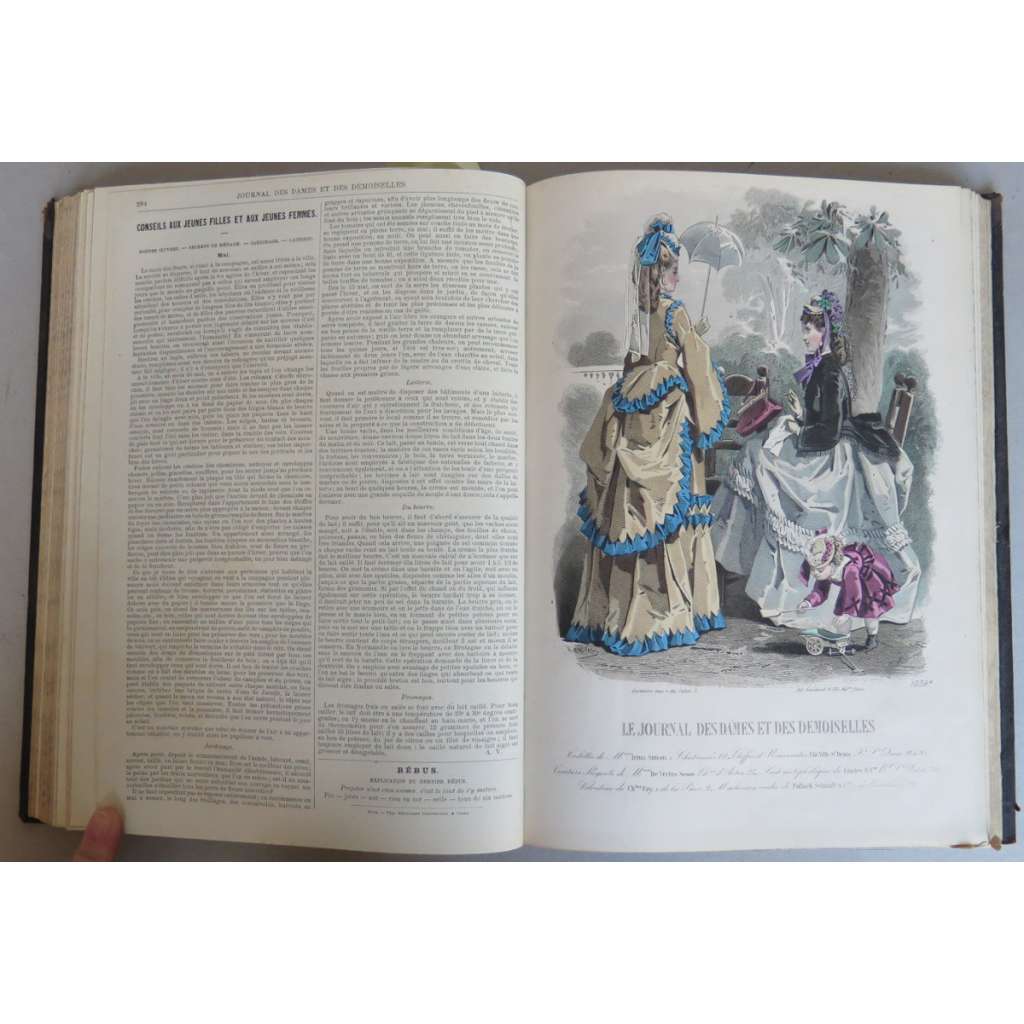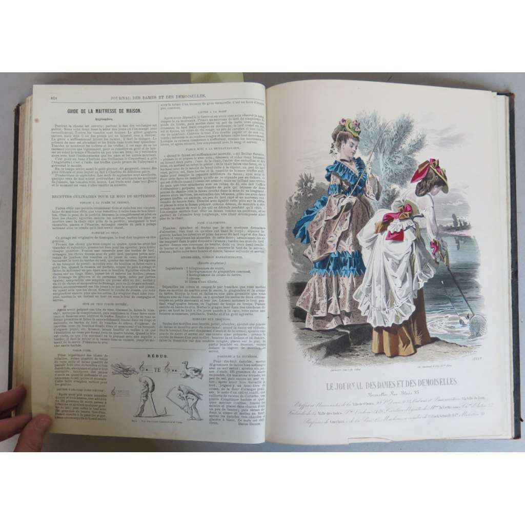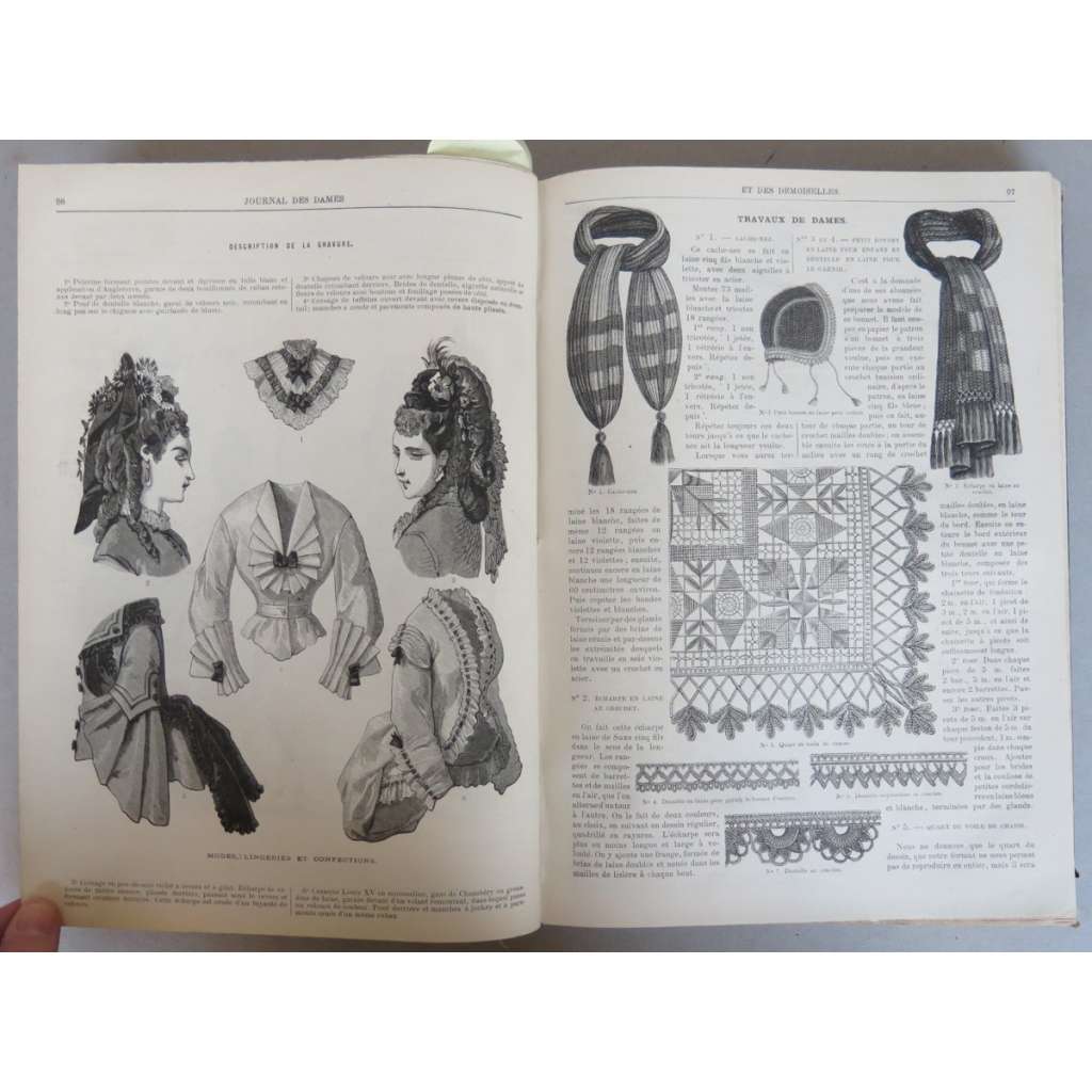 Guide complèt de tous les travaux de Dames. Litterature choisie, avec illustrations, modes, lingeries, travaux avec figures, recettes, etc. Littérature choisie, avec illustrations, modes, lingeries, travaux avec figures, recettes, etc. Gravures de modes colorièes à l'aquarelle d'après les dessins composés spécialement pour le journal. Collection nombreuse de broderies en tous genres, guipures, crochet, filet, par A. L'Évêque. Grandes planches de confections. Patrons de grandeur naturellee pour toute espèce de vêtements. Tapisseries coloriées fac-simile d'aquarelles, sépias, etc.
