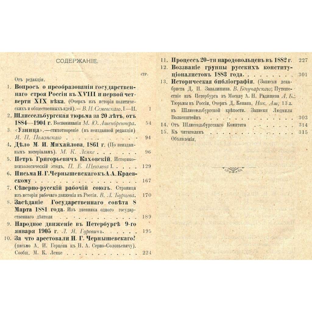 Kompletní 1. ročník významného ruského radikálního historického měsíčníku. Zabýval se historií ruských revolučních hnutí od 18. století po revoluci v roce 1905. Viz naskenovaný obsah 1. čísla. Svázáno do šesti svazků po dvou číslech; celý soubor obsahuje dohromady 67 tabulí s ilustracemi (vesměs fotoportréty různých aktivistů a revolucionářů). Časopis byl zakázán v říjnu 1907; navazoval na něj časopis "Minuvšie gody".