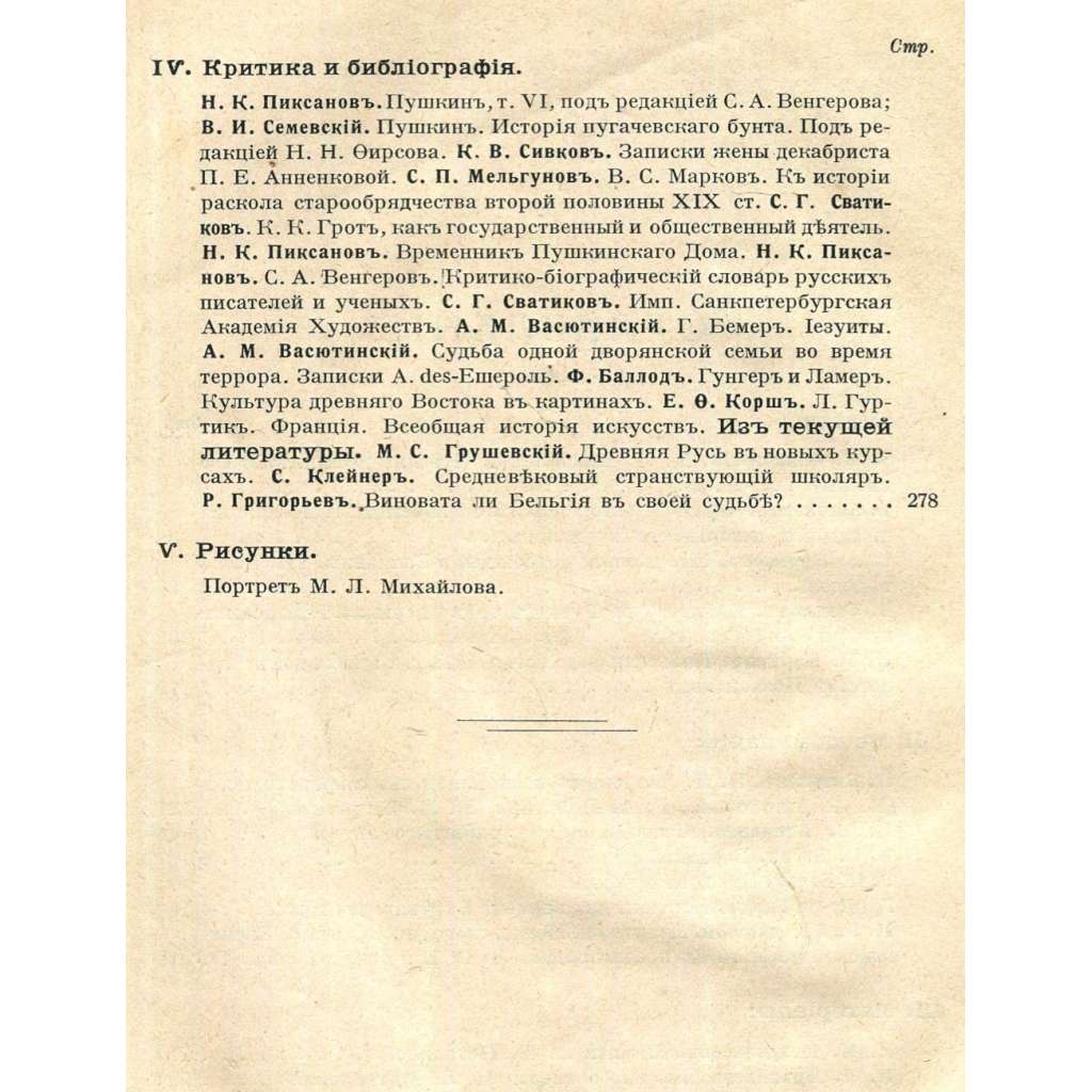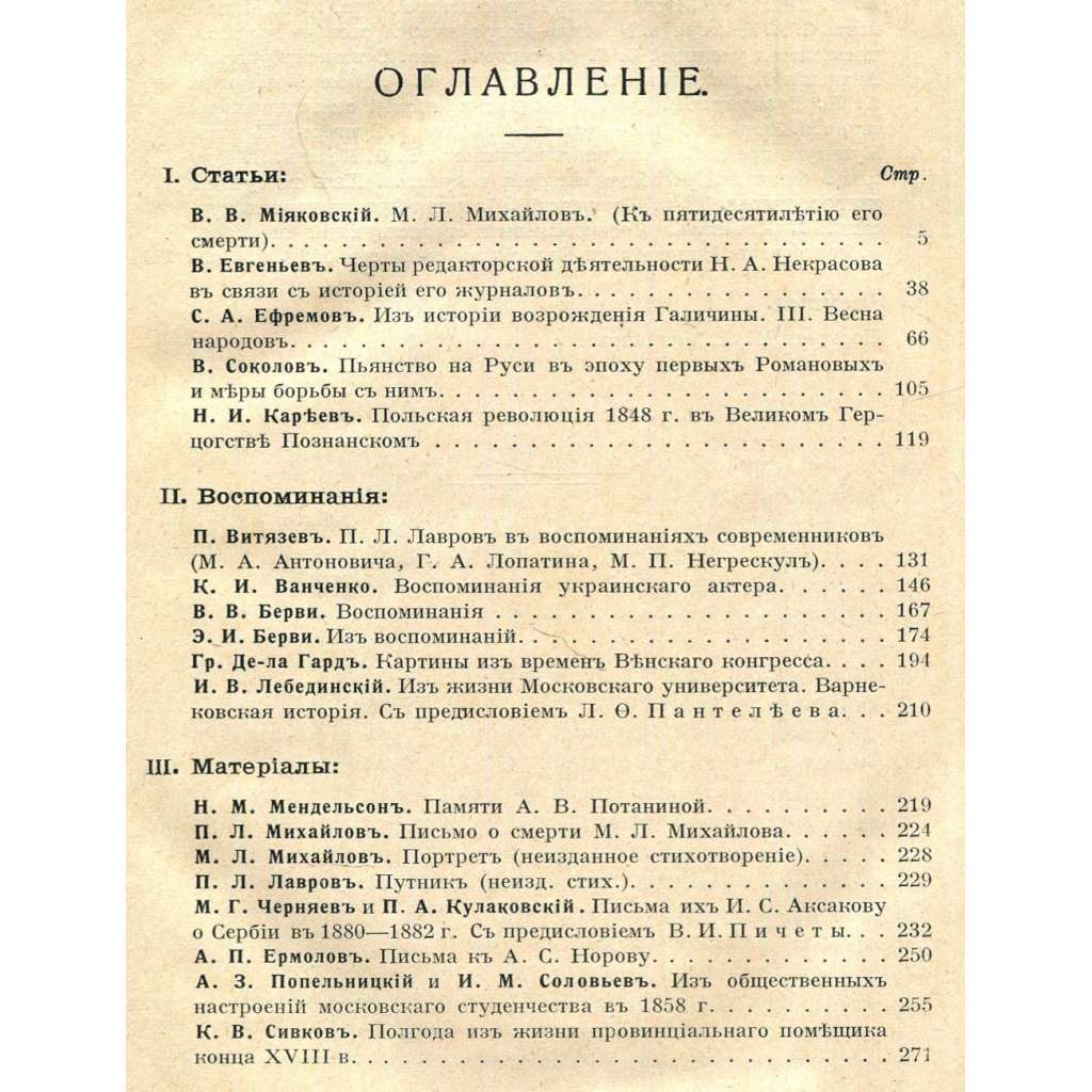 Jedno číslo (září 1915) významného ruského historického měsíčníku zaměřeného především na dějiny progresivních hnutí, intelektuálních směrů a literatury Ruska. Viz naskenovaný obsah. Svazek obsahuje jednu tabuli s ilustrací; stránky jsou zdobeny vlysy a koncovými vinětami.