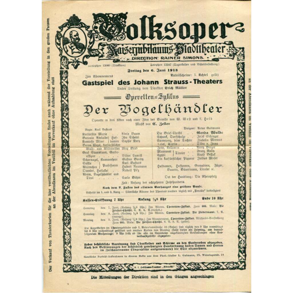 Obsahuje plakát s detailním programem Wiener Volksoper na pátek 6. 6. 1913 a přehledem na další dny 7.-9. 6. 1913 v rámci tzv. "Operetního cyklu / Operetten-Zyklus der Wiener Volksoper".