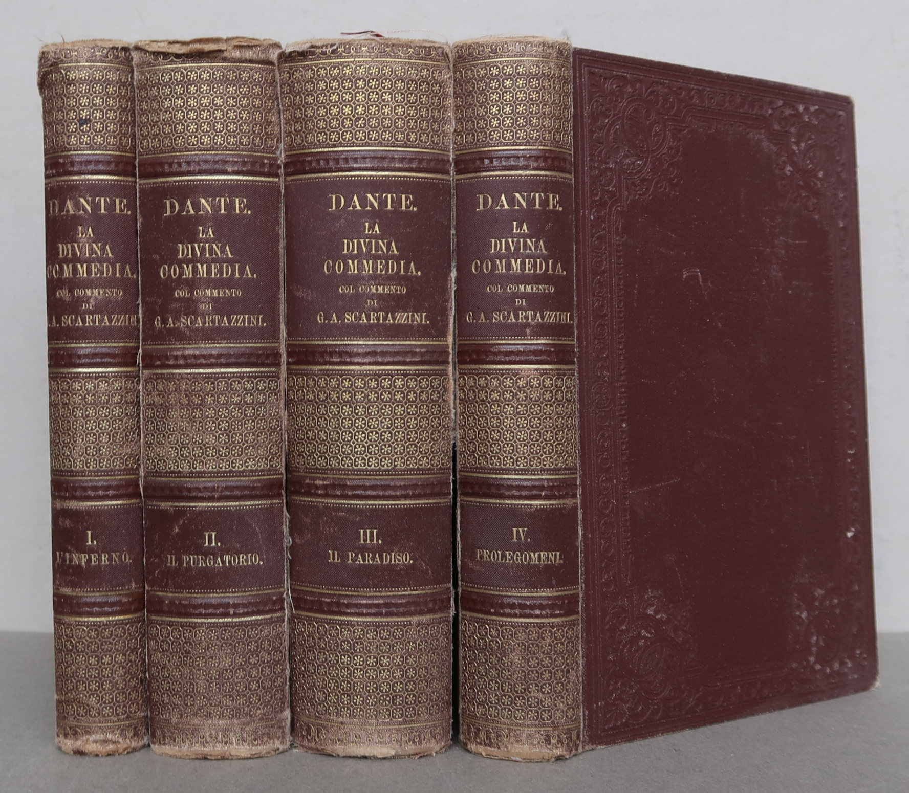 Leipzig: F. A. Brockhaus 1874, 1875, 1882, 1890. Riveduta nel testo e commentata da G. A. Scartazzini. (Volume Primo: L' Inferno; Volume Secondo: Il Purgatorio; Volume Terzo: Il Paradiso; Volume Quart