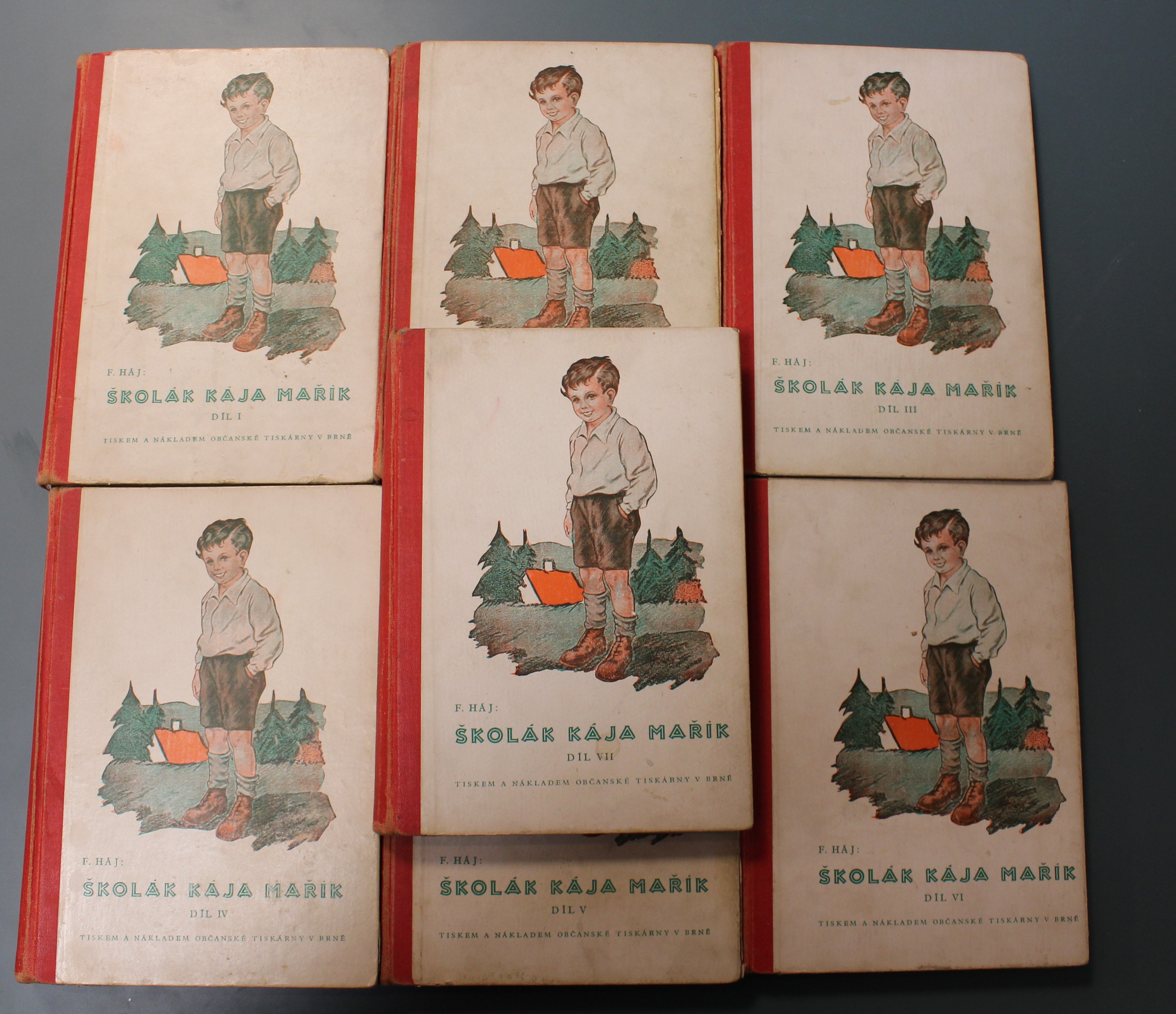 hřbet vybledlý, desky a hrany desek lehce odřené, přední deska trochu počmáraná, jinak uvnitř v dobrém stavu