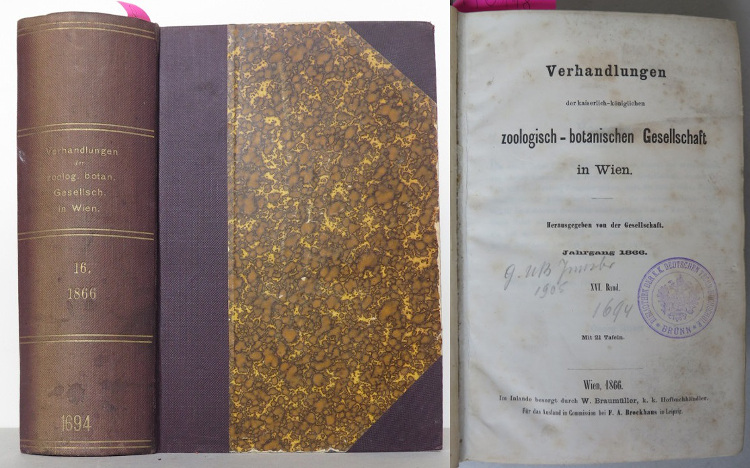 Wien: W. Braumüller, k. k. Hofbuchhändler 1866, poloplátěná vazba s titulem na hřbetu, mramorované desky a ořizka, LIX+1000 stran s 21 (částečně skládanými) tabulemi, 8° (17 x 21,5 cm)