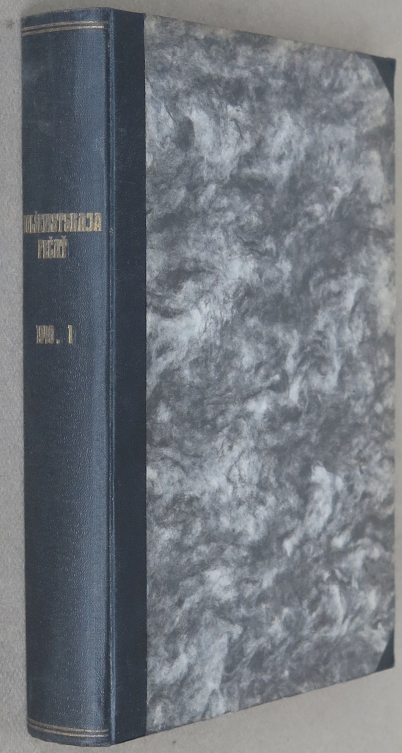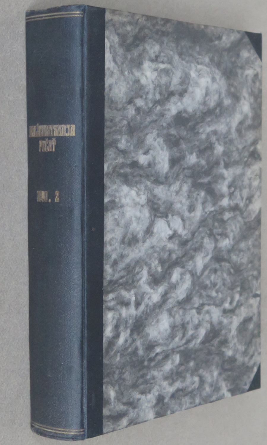 Velmi dobrý stav; na zadní desce je nalepen štítek knihovny, na předsádce je několik razítek a signatura, na původní obálce a několika stranách je razítko, na obálce také poznámky psané tužkou, část l